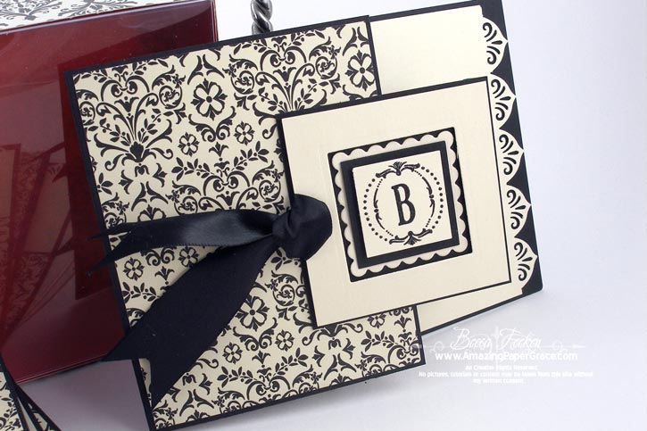 The main item is the monogrammed note cards – I made a set of six. For some reason I always prefer top folded cards and this week I’ve been pleasantly surprised at how much I’m liking side fold cards. This is a side fold card that leaves much of the inside layer exposed so I thought I’d pretty it up. After designing the layout of the card I knew that adding a small, crisp, one letter monogram using JustRite Damask Centers and 60 Point Font, would be a fairly clean look. It’s hard to tell in the photo but the monogram sits inside a small square frame that I have popped up – then the last tier (the "B") is popped up. Below is a picture of the card set unboxed.