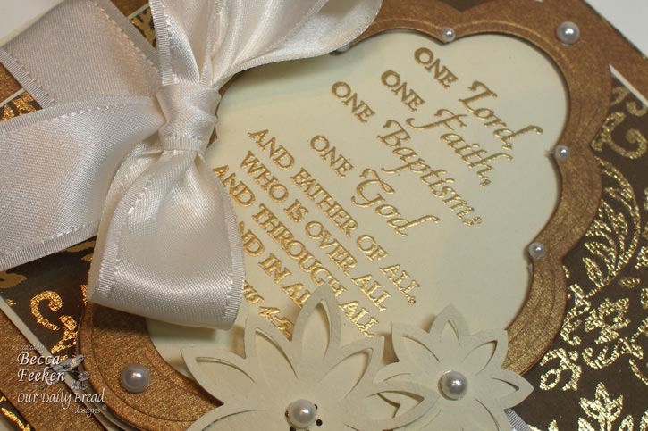 So now, about my card.  I selected a powerful sentiment from the newly released Baptism and Confirmation Verses Set.  Using Spellbinders™ Labels Six set to make a frame, I used MS punches for the flowers, and tied ribbon to finish the design off.