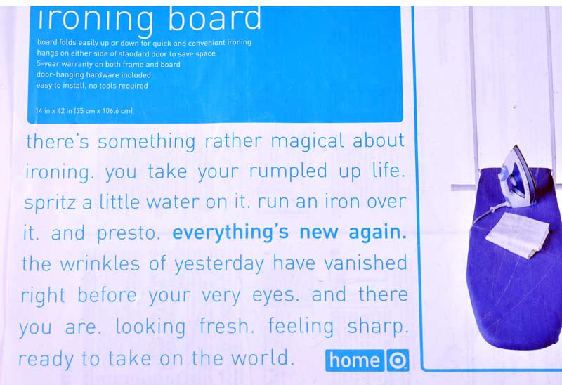 I guess I’m one of those odd people that loves to iron. There’s something about running a hot steamy iron over crumpled fabric and watching it smooth out that just facinates me. The analogy on your ironing board packaging is fitting. I often iron in the living room while my husband watches TV so we can be together.