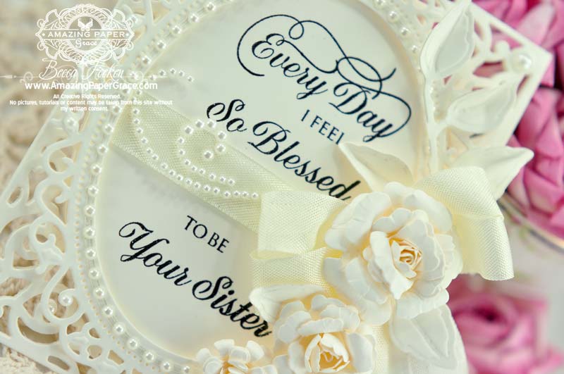 Again, elegant and lovely all wrapped up in cream and pearls, ribbons and bows. A note to those wanting to know how you cut the dies…see the tutorials! I just ordered the words stamp set! Can’t wait for them to come as they just fit so many occasions. Keep the ideas coming!