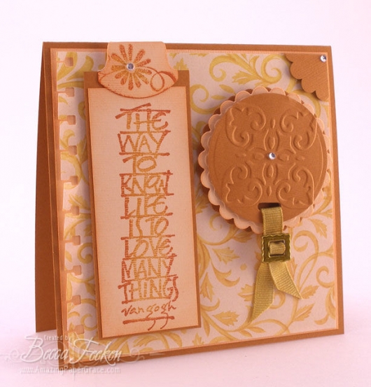 The card is a simple one, I started with a dark gold card base topped with a lighter gold panel and design paper.  The sentiment, one of my favorites, is popped up on a dark gold and lighter gold panel which is sponged with SU – Really Rust.   The sentiment is stamped in SU – More Mustard with the edges of the stamped rolled with SU – More Mustard.  Two Nestabilities scalloped circles back a Nestabilities circle embossed with a Cuttlebug plate.  The circles are punched with a word slot and threaded with grosgrain ribbon held by a slide.  Incidentally I could not find the right color ribbon to save my life, so I colored the white grosgrain ribbon with Copic Marker Y26.  The last embellishments were a scallop punch cut to form a photo corner, the round tab added to the top of the sentiment and rhinestone bling.