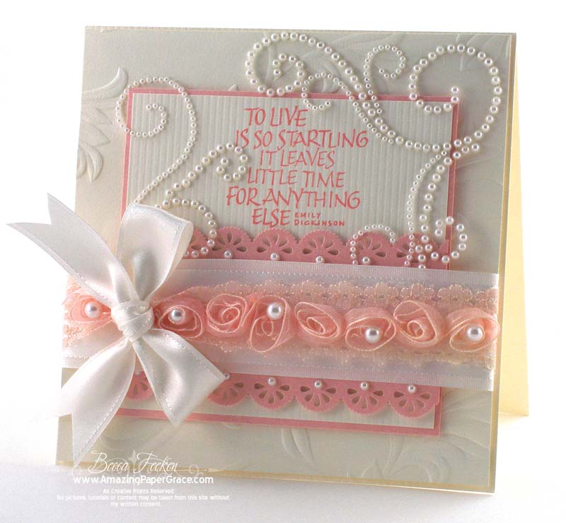 Becca, My prayers are with you and your husband today. I just know all will come out great! Thanks for sharing todays project! To say it is stunning is just not saying enough! I love the gorgeous pink and all of those pearls! Your ribbon is beautiful! TFS!