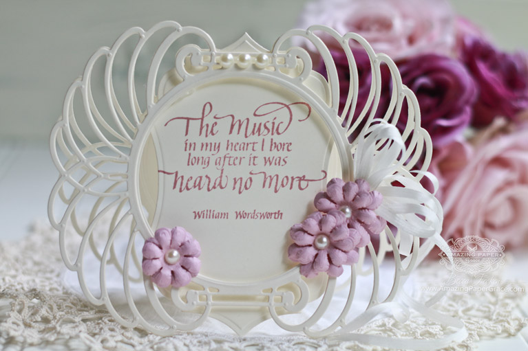 Sweet friends today the Creative Team and I are bringing more Venise Lace Inspiration. I’m getting a chance to create with these dies for the first time and experimenting with how they fold and layer and look with one another, so I have a card today too. It’s a long post but because you asked, we want to give you several ways to use the dies. My card today is quite simple – the feel I was aiming for is the open and airy feel that you get from lace. This almost looks regal to me and I could very much see this as a wedding card or a little or big princess card. Today I’m using a Quietfire Design sentiment called The Music in my Heart. Just a note . . . so often I design in ovals and long shapes because they are my favorite. This has a perfect circle center which is a change for me, but after working with the die, I’m really glad, it’s going to give me some good layering possibilities :-)